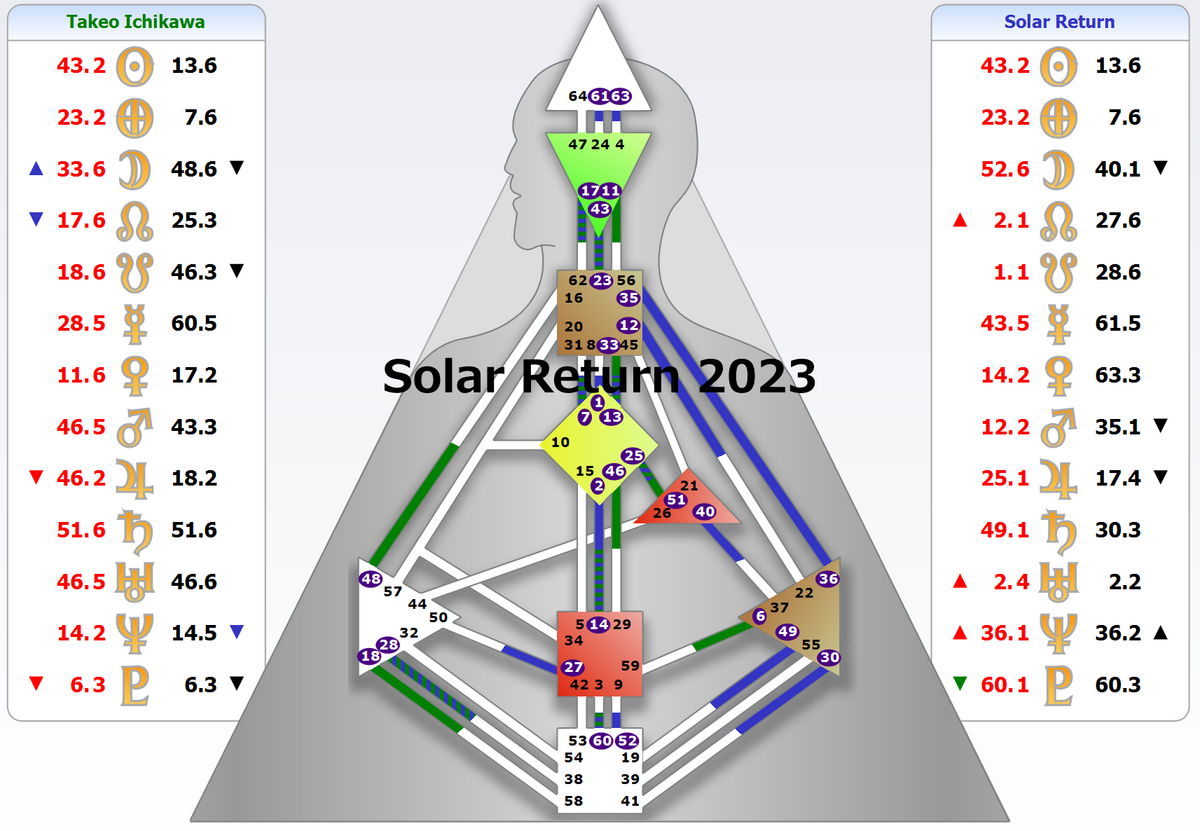 一方、ノースノードは、2番ゲート「自己の方向性」と27番ゲート「家族や仲間内のお世話」にあります。となると今年後半になるにつれて、間違った方向に向かう人たちが現れたり、お世話や教育を受けていない弱者が現れてくるのでしょう。特に14-2「鼓動」チャネルの「妥協」から考えると、間違った方向に向かう人たちをどうにかしようとしても、状況的に上手くいかず、イライラしがちになるのでしょう。まあ、その影響に引っ張られなければ良いだけの話ですが、それこそまた、なんちゃらカードみたいなモノが売り出されて、それに群がる人たちを見たら『おいおい、そっちに行くな』とか思っちゃうんでしょうね。