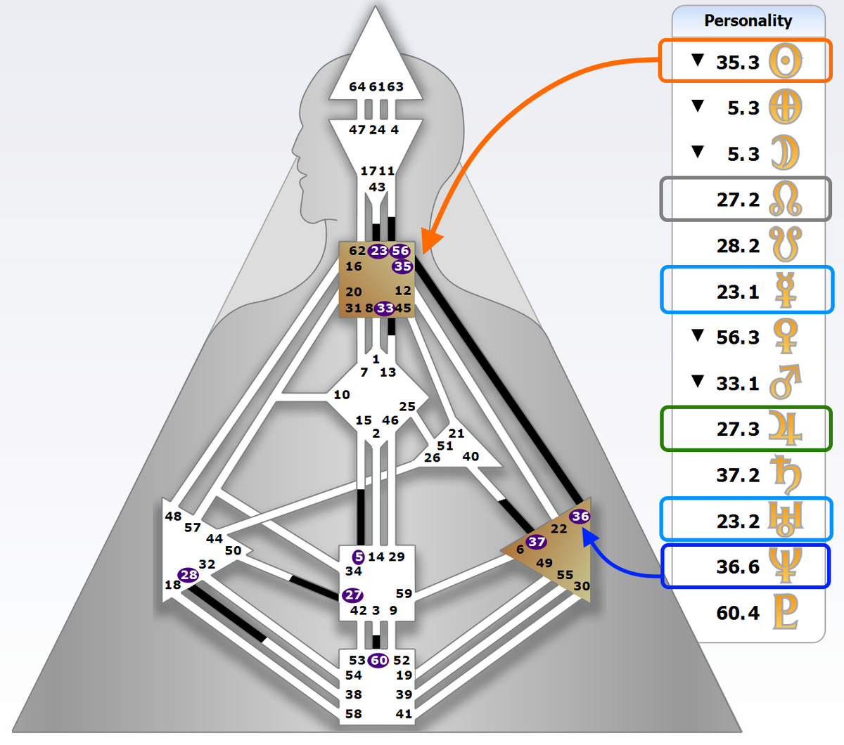 さらに水星と天王星も、23番ゲート「同化・解体」でほぼ重なっています。ここは頭で考えたことを、相手になじませるために(同化)、噛み砕いて(解体)説明するゲートです。天王星はトリッキーな星ですし、水星はコミュニケーションの星です。この力に影響されると突然、思いも寄らぬ独特な話を説明し始めるでしょう。