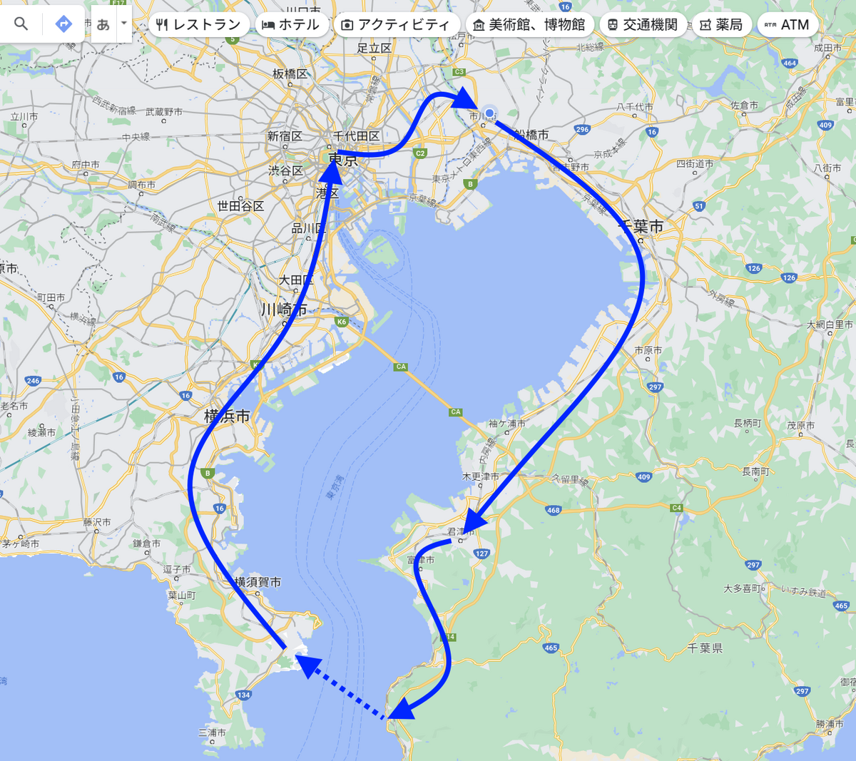 そしてJR久里浜駅から、14:44の東京行き横須賀線快速に乗って、地元へとUターンです(結局、行きの車内では食べなかったナッツを帰りの車内でポリポリ)。下の図のように、ぐるっと東京湾を一周するコースとなりました。まあ、いつものように、ただ乗り物に乗っていただけですが、良い気分転換になりました。このルートを仕事で使うことは無いでしょうが、こういった天気の良い日にフェリーに乗りに来るのはアリですね。そして今日は海を満喫しましたが、明日からは海の無い群馬県に一泊旅に行きます。まだまだ、のんびりウィークは続きます……(^_^)