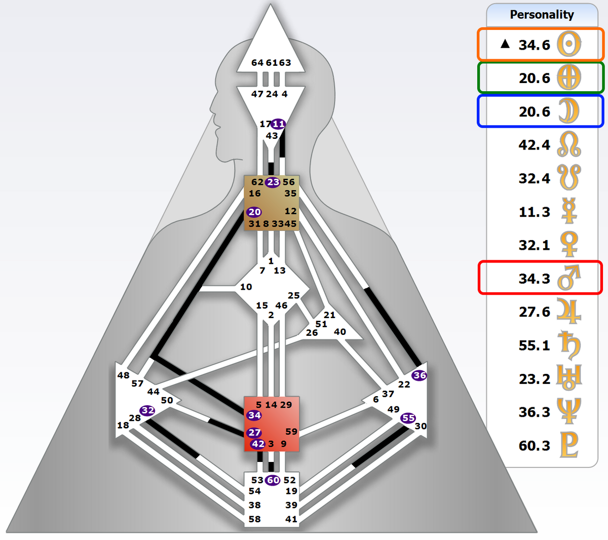 そして太陽と火星は、チャネルの反対側の34番ゲート「全力」にあり、20-34「カリスマ」「忙しく働くほど魅力的に見える」力となっています。そして太陽は34.6▲「自分が使える程度の力をわきまえ、その力を使うべき時を知り、その力をほどよく解放する」にあり、火星は34.3「自然と男らしい力ばかりが無差別に誇示される」か「男らしい力を控えて本当の自分を隠し、人とつきあう」にあります。